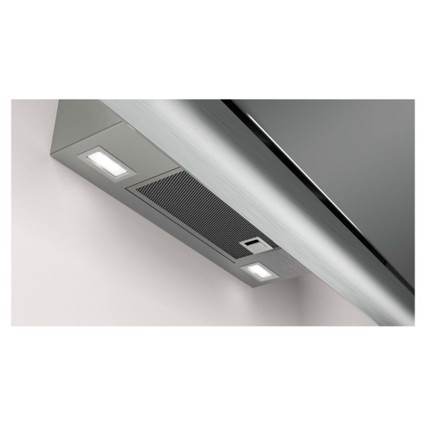 Tiene 90 cm de ancho, filtros multicapa de aluminio y un filtro adicional de 7 capas en la parte inferior, en conjunto con un atractivo acabado en cristal gris antracita.