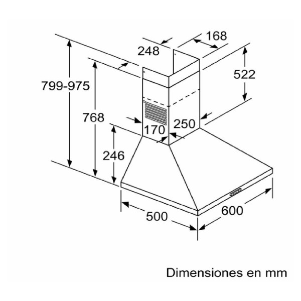 Esta campana extractora tiene un ancho de 60 cm y una profundidad de 50 cm, con un conducto decorativo adaptable entre 79,9 y 97,5 cm. Un tamaño perfecto para cocinas de cualquier tamaño.
