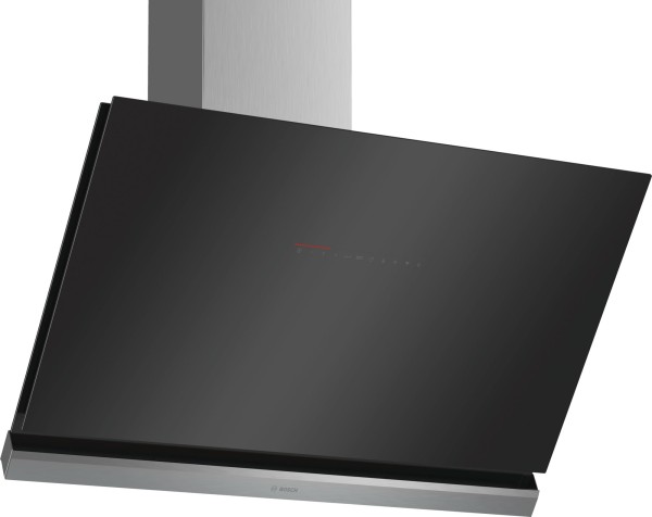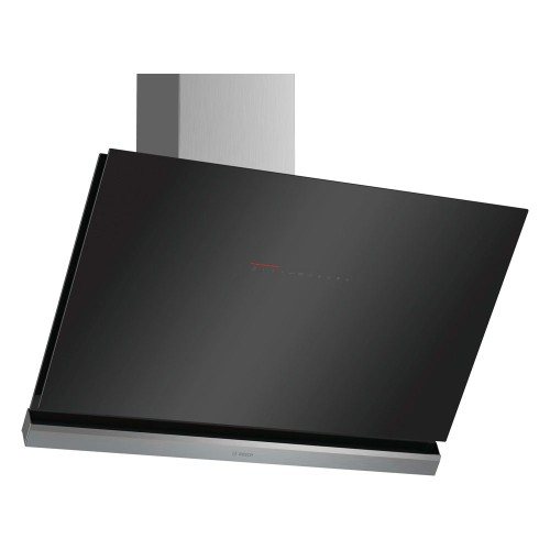 La campana extractora decorativa de pared Bosch DWK98PR60 fusiona funcionalidad y elegancia con su diseño en cristal negro y detalles en acero inoxidable.