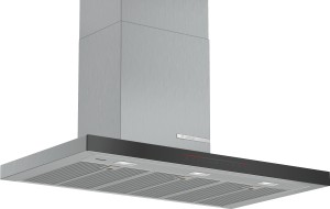 La campana extractora Bosch DWB98PR50 presenta un diseño vertical en forma de T con acabado en acero inoxidable y su frente es de color negro donde se ubican los comandos.