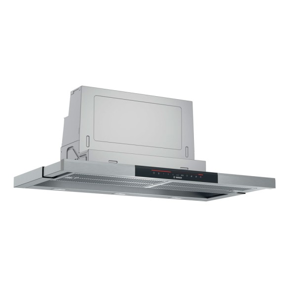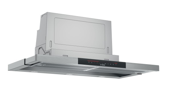La campana extractora telescópica Bosch DFS097K51, con su diseño integrable en mueble de cocina, aporta un estilo sofisticado y moderno.