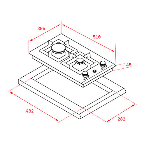• 2 quemadores de gas (auxiliar 1,00 Kw + rápido 3,00 kW)