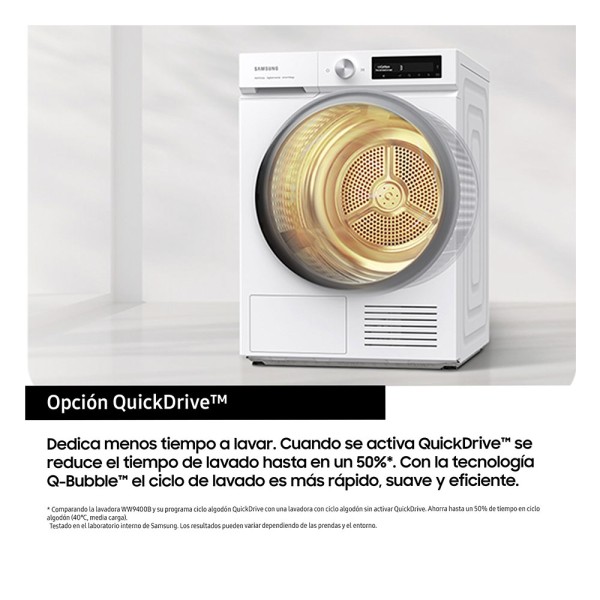 Lava más rápido con QuickDrive™, una opción que reduce notablemente tiempo de lavado de 11 programas*. Q-Bubble™ combina una rotación dinámica del tambor con inyecciones extra de agua para generar más burbujas y conseguir que el detergente penetre rápidamente para lavar a ropa a mayor velocidad y de
