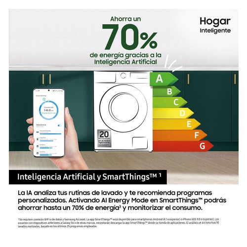 Disfruta de un lavado eficiente y sin p-complicaciones con la aplicación SmartThings*. AI Energy Mode te ayudará a gestionar el uso de energía, y el modo `Home Care` mantiene la lavadora en las mejores condiciones. Además, si tienes una secadora en casa puedes emparejarla con tu lavadora.