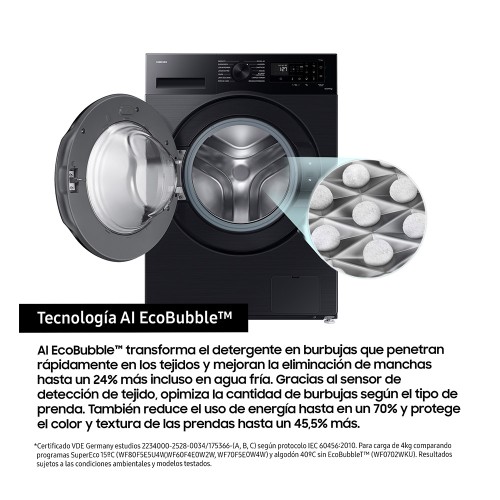 Al EcoBubble TM transforma el detergente en burbujas que penetran rápidamente en los tejidos y mejoran la eliminación de manchas hasta un 24% más incluso en agua fría.
