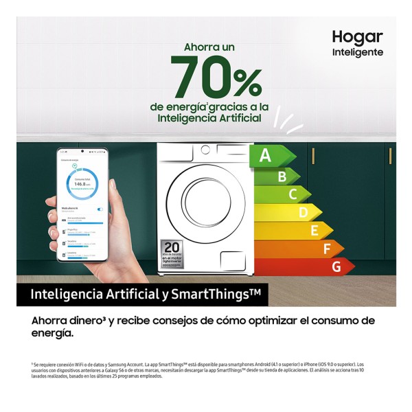Disfruta de una experiencia de lavado más personalizada y eficiente con SmartThings y la Inteligencia Artificial. La IA analiza tus rutinas de lavado y te recomienda programas personalizados. Puedes activar AI Energy Mode para ahorrar hasta un 70% de energía y monitorizar el consumo[1].
