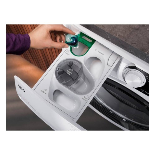 Las lavadoras AEG de la Serie 8000 PowerCare utilizan una tecnología exclusiva que premezcla rápidamente el detergente antes de llegar al tambor, asegurando que se distribuye uniformemente sobre la ropa. PowerCare optimiza el poder del detergente incluso a 30 °C para que obtengas unos resultados de lavado extraordinarios en menos de una hora.