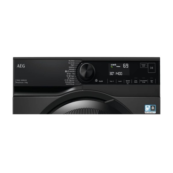 Lavadora AEG de la Serie 7000 ProSteam y cajón AutoDose y conectividad, de 9 kg de capacidad y centrifugado de hasta 1.400 rpm, panel de control Negro y puerta Negra, motor Inverter, programas a vapor ProSteam que reducen el planchado y tecnología PreciseWash que ahorra tiempo, agua y energía y tambor Care